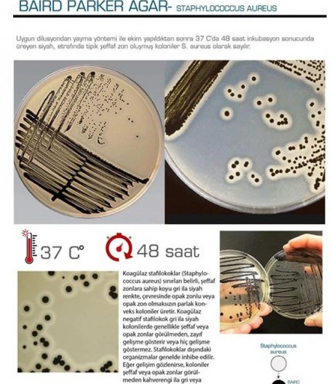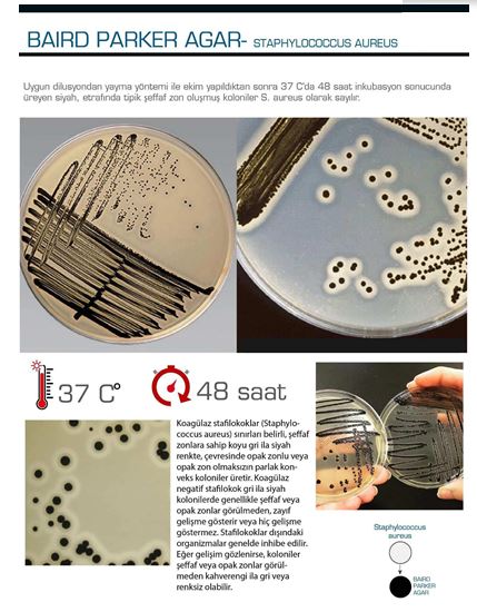 Uygun clilusyondan yayma yöntemi ile ekim yapıldıktan sonra 37 C'da 48 saat inkubasyon sonucunda üreyen siyah, etrafında tipik şeffaf zon oluşmuş koloniler S. aureus olarak sayılır.