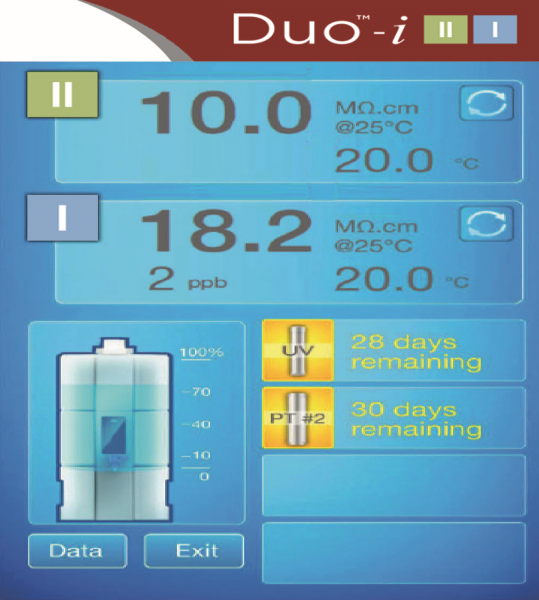 Duo™ II.I su saflaştırma sistemi; kullanımı kolay, bir sistemde iki su kalitesi sağlar – Tip 1 (Ultra Saf) ve Tip 2 (Deiyonize). Toplam Organik Karbon (TOC) izleme, organiklerin sonuçları etkilediği yerlerde kritik öneme sahiptir, bu nedenle gerçek zamanlı TOC okuması, su kalitenizde mutlak güven sağlayacaktır.