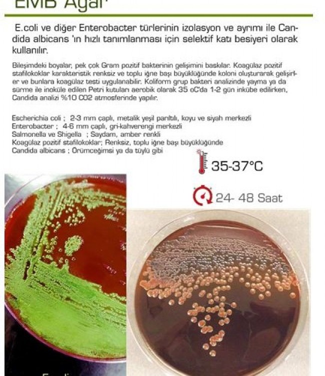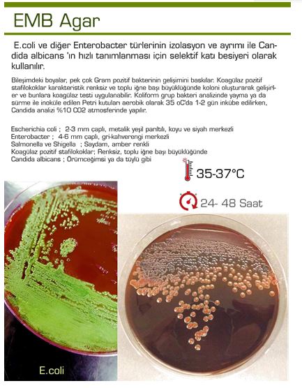 E.coli ve diğer Enterobacter türlerinin izolasyon ve ayrımı ile Candida albicans'ın hızlı tanımlanması için selektif katı besiyeri olarak kullanılır.