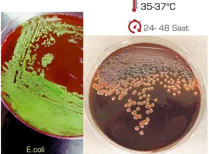 Escherichia coli ; 2-3 mm çaplı, metalik yeşil parıltılı, koyu ve siyah merkezli