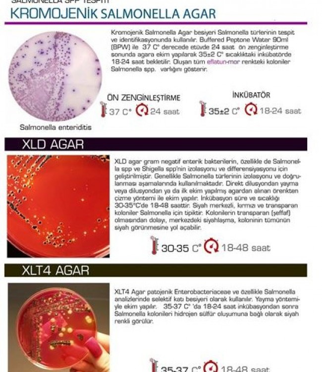 Kromojenik Salmonella Agar besiyeri Salmonella türlerinin tespit ve identifikasyonunda kullanılır. Buffered Peptone Water 90ml (BPW) ile 37 C’de etüvde 24 saat ön zenginleştirme sonunda agara ekim yapılarak 35+-2 C sıcaklıktaki inkübatörde 18-24 saat bekletilir