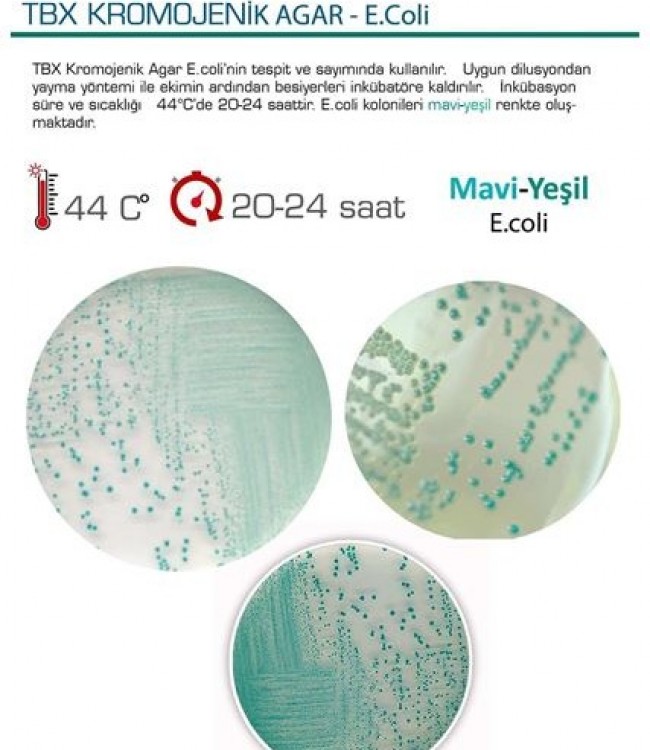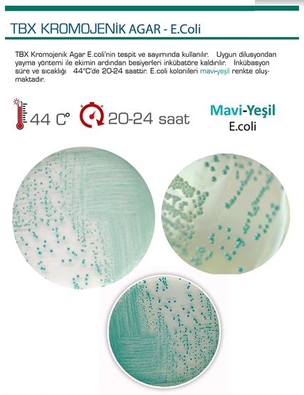 TBX Kromojenik Agar E.coli’nin tespit ve sayımında kullanılır.